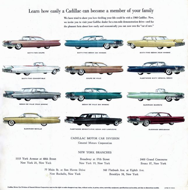 A four-window Series 62 sedan (seen in gunmetal gray in the above ad) with a ‘flying wing’ roofline was also available for the same amount, $5,080. The Series 62 was the ‘standard’ Cadillac, with the Sedan and Coupe de Villes the next step up the ladder, followed by the Fleetwood Sixty Special, Eldorado Seville and Biarritz, the Fleetwood Seventy-Five series long-wheelbase sedan and limousine (starting at $9,533) and the Italian-built Eldorado Brougham at the absolute pinnacle, with a sobering $13,075 suggested retail price!