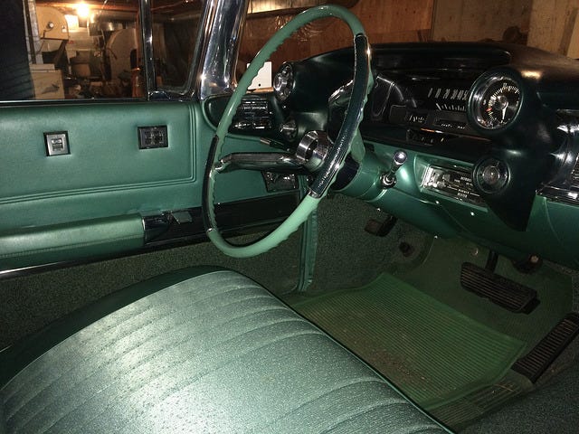 “The remarkable amount of optional equipment on this car supports the thought that it may have been ordered for a GM executive. The pictures show air conditioning (which was then on less than half of all new Cadillacs), cruise control, power windows, power vent windows, and power door locks, as well as the original floor mats.”