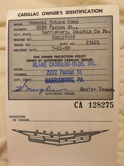 “As to why the original owner would be shown as General Motors Corp. at the dealership address, I can only hazard a guess. Some of the larger Cadillac dealerships in those days were also “distributorships”, which had a closer relationship to the factory than the typical dealership. As the major Cadillac dealer in the capital city of Pennsylvania, Blake may have been one of those distributors. If so, that could explain why Cadillac had a zone office or some other local presence at the dealership address. Perhaps the car was ordered for the use of a GM executive whose job entitled him to drive a company-owned car for some period of time.”