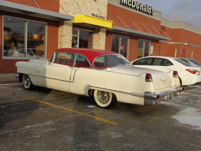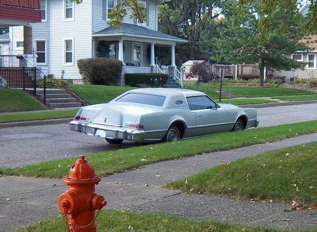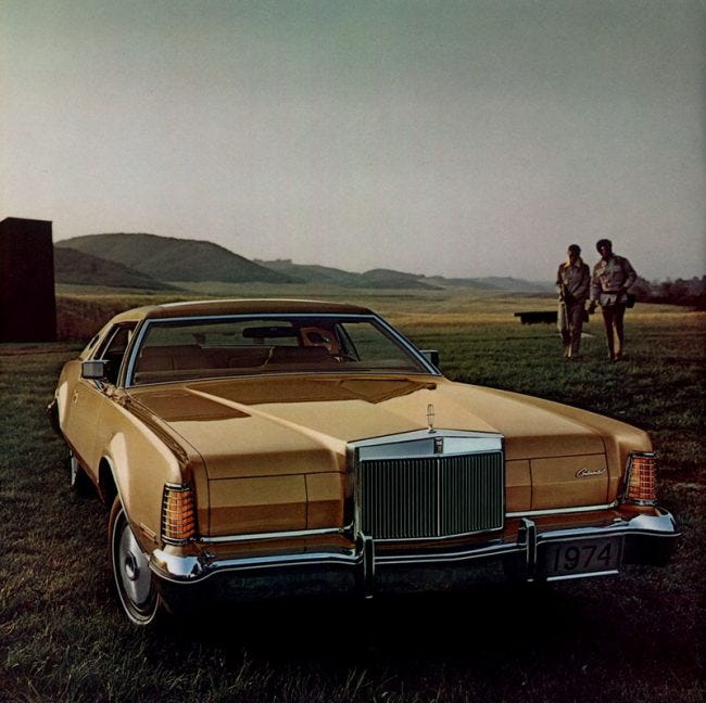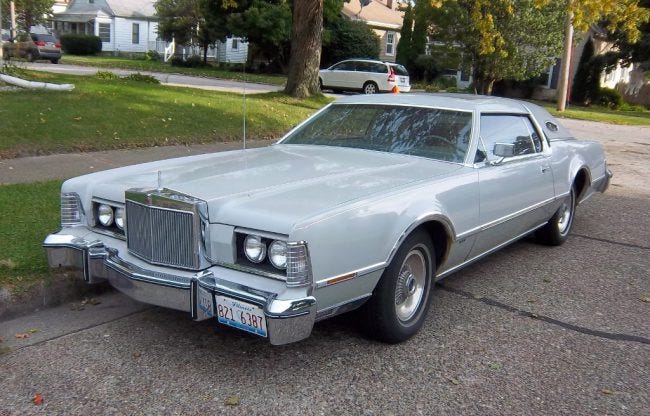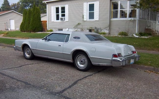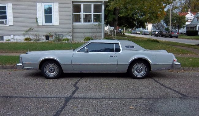 I live in the Midwest. So most people may think the cool cars hide out for half of the year. But not always! For instance, just this month I saw 1956 Cadillac Coupe de Ville at a McDonald’s out by the airport. That one nearly caused me to drive off the road, I was so surprised. But today let’s check out this personal-lux cruiser from the ’70s: The Continental Mark IV.