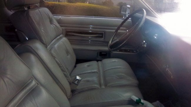 Some rust, but it was all there, right down to the polished alloy wheels, whitewalls and landau top. The interior photos didn’t come out great due to heavily tinted windows, but the dove gray leather seats were in nice shape as well.