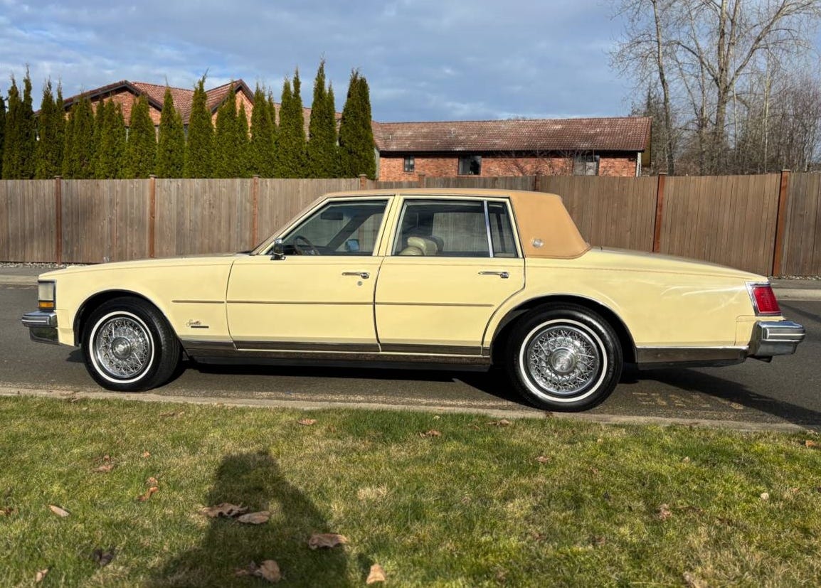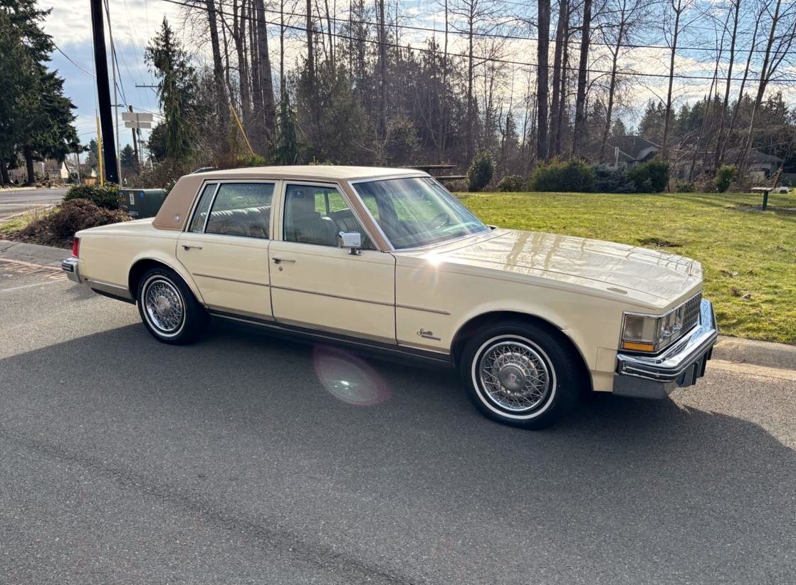 That’s a rare interior color for a first generation Seville and really works with the Calumet Cream. It is a much nicer color in person. Jayson is correct that appears to be all original and has been pampered as the steering wheel still has the fragile (after 50 years) wood insert in the rim. That is a good buy for under $10k.