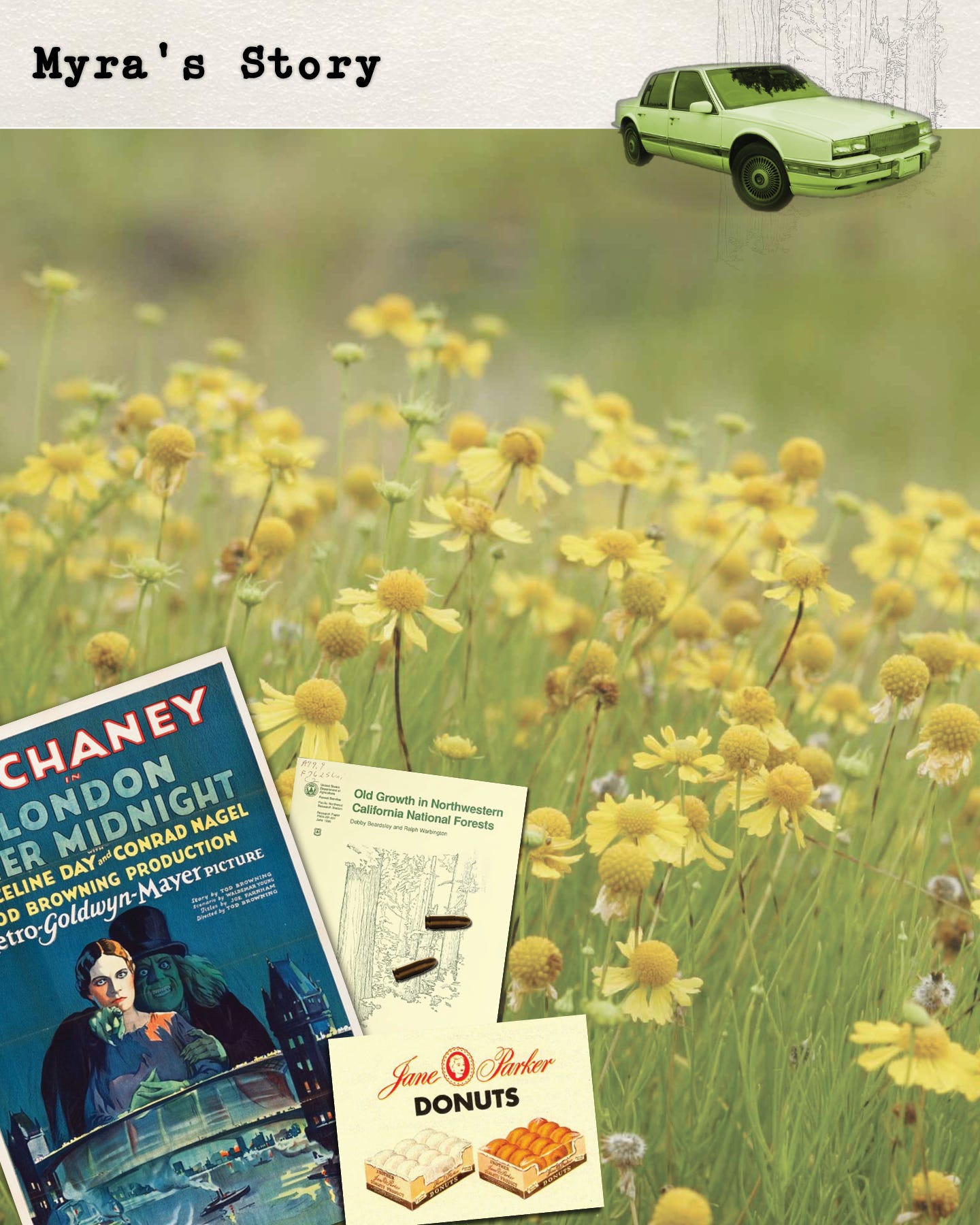 Sitting at the patio table in her postage-stamp backyard, Myra chain smoked an almost full pack of stale Virginia Slims she’d found in the kitchen junk drawer, straining to hear anything from the garage except the civilized idle of the Seville’s engine. Not wanting to run the cheerful little car out of gas and add that complication, she gave it half an hour before holding her breath, reopening the garage door, and fleeing back to the condo.