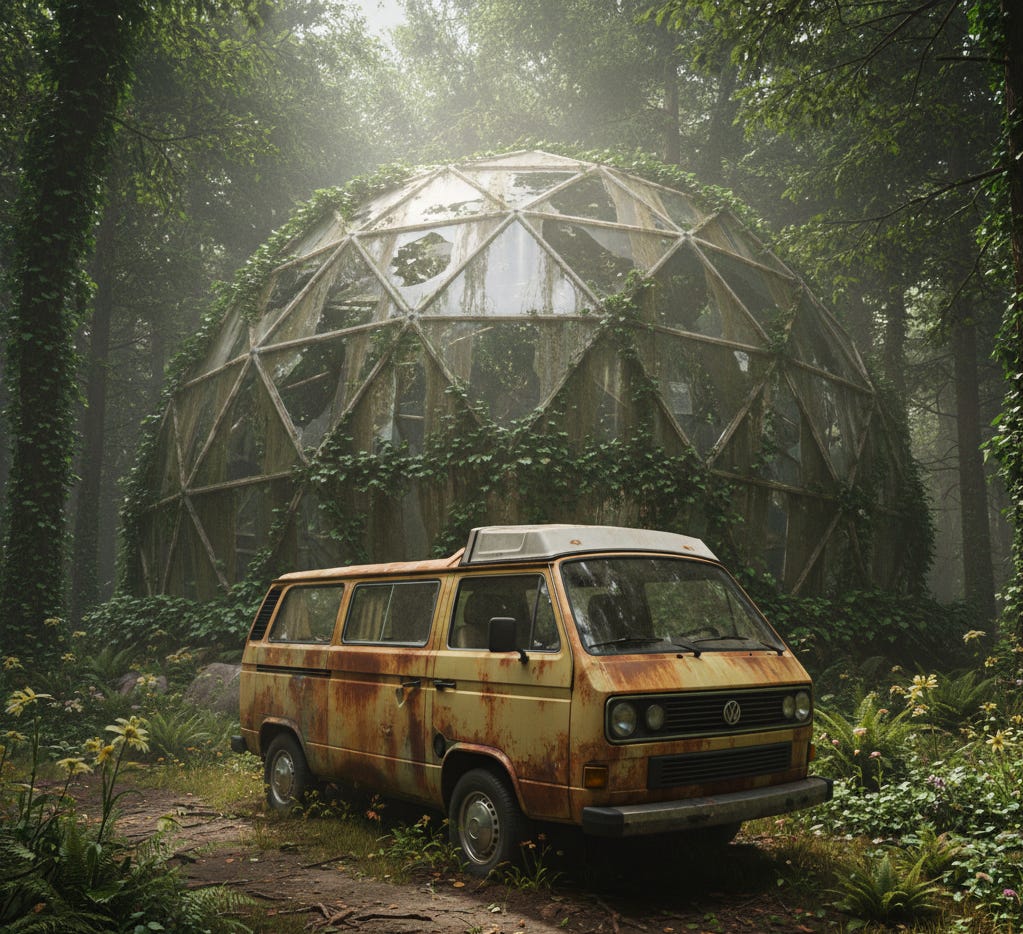 The Vanagon hadn’t moved since Bills’s last visit but was now a stripped shell, its air-cooled engine long gone, the rear hatch missing like an open wound. It took some effort to push open the dome’s damp, swollen door. Inside he waited for his eyes to adjust to the gloom. The clear plastic panels had grown a skin of thick moss, blocking out most of the morning sunshine. Bill moved on.