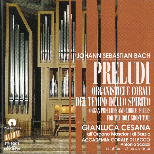 There are so many well-played and well-recorded versions of the Bach organ prelude “Kyrie, Gott heiliger Geist” that it is difficult to pick just one. Gianluca Cesana’s excellent recording of a selection of Bach Preludes for the liturgical season of Pentecost differs from the usual pipe-organ recital, in that his solo-organ pieces alternate with a-cappella Bach choral works, beautifully sung by the Accademia Corale di Lecco.