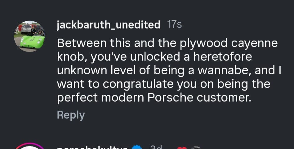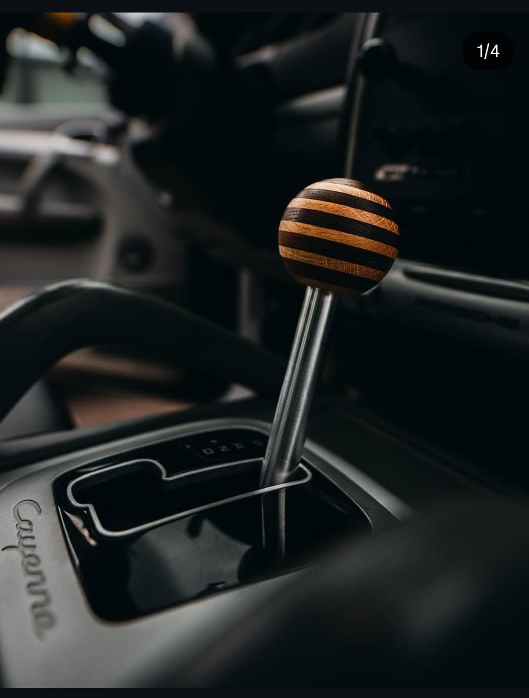 Yup, that’s a fake, er, “tribute” 917 plywood shift knob adapted to the automatic transmission selector of an SUV.