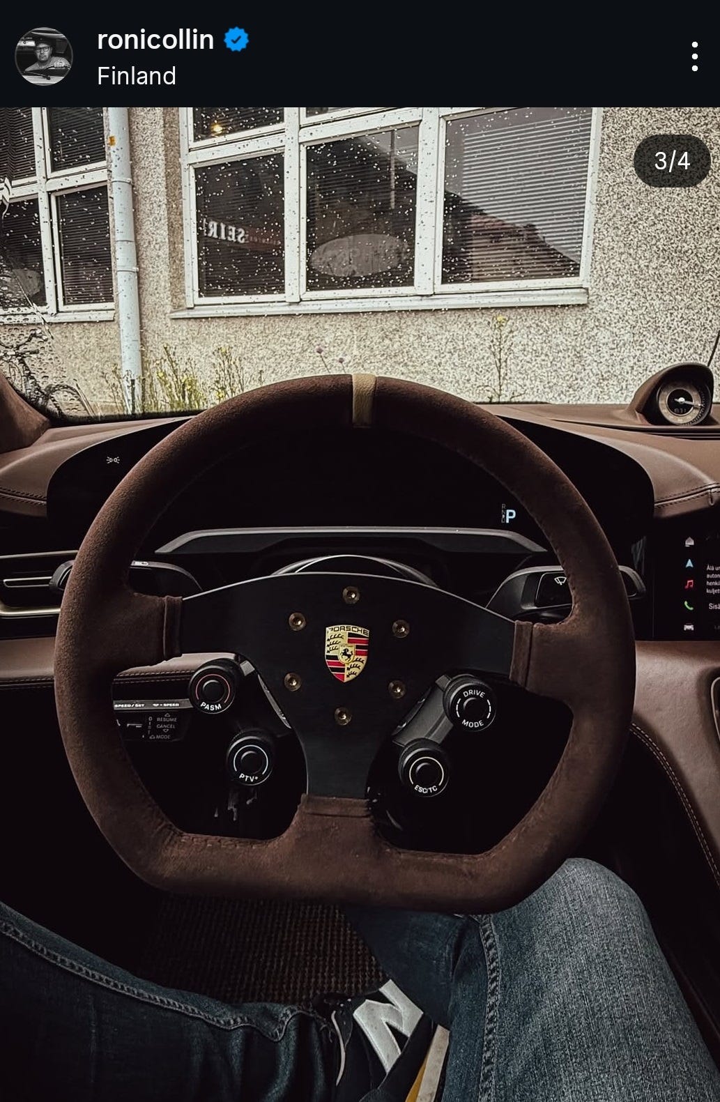 Just for fun, I also want to share the following photos with you. A reader sent me a link to the Instagram account of a fellow who did a custom chocolate-Alantara wrap and some custom electrical work to adapt a GT3 Cup car steering wheel sans airbag to… a Taycan.