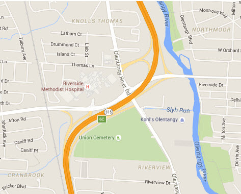 This is the so-called "hospital curve" on Route 315. It curves around --- wait for it --- Riverside Methodist Hospital. During rush hour, it's typically either stop-and-go or very slow-moving. So while I'd believe that a truck could jump and flip over the barrier during the afternoon or evening, in the morning there shouldn't be any way for it for to have enough momentum for the maneuver.