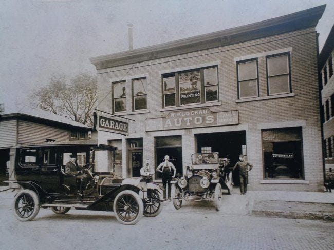 This was my great-great-grandfather’s car agency in downtown Rock Island. William Klockau and his son, my great-grandfather, Walter John Klockau, sold Ford, and later on, Jeffery motor cars. They were originally blacksmiths and coachbuilders in Germany before they came to the U.S. This picture, showing a line of Jeffreys, dates probably from circa 1915.