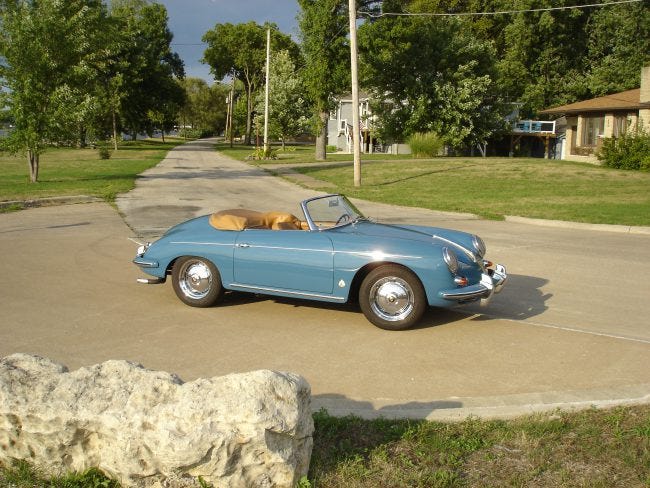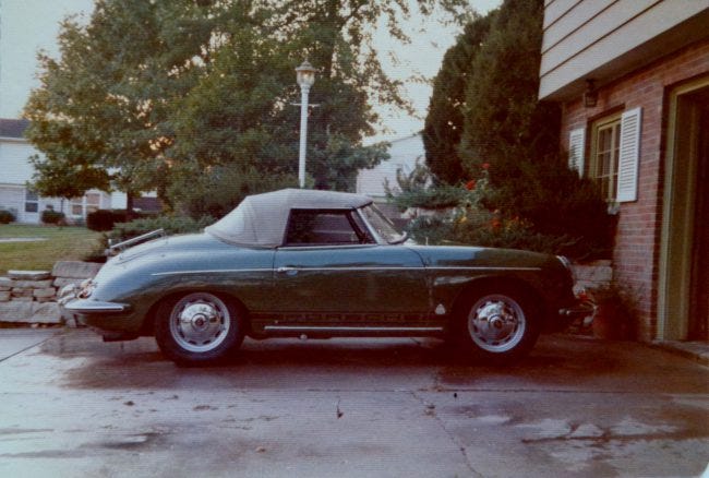 Getting back on track, my grandfather, Bob Klockau, served in WWII, got on the GI Bill when he came home, and became a lawyer, traveling to the University of Illinois on his Henderson motorcycle. He also started an insurance company, Illinois Casualty Company, which provided liquor liability insurance to bars, restaurants and taverns, and his law firm provided attorneys to defend their claims on the newly-introduced dram shop act. My dad came along a couple years later, and upon getting his driver’s license, was gifted a Poppy Red 1965 Mustang convertible. Now don’t get too excited, it was a six that was originally his secretary’s car! A little bit later he bought a BRG 1965 Triumph TR-5. Nice car-when it ran. After a relatively short time, he got sick of the constant oil leaks and electronic maladies, and got his first Porsche. A 1960 356B T-5 Roadster, as seen above.