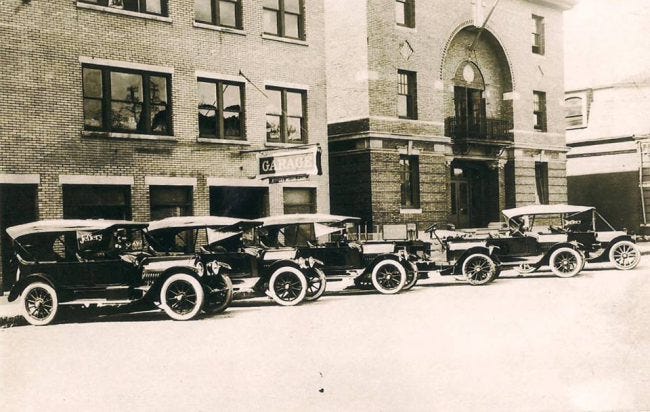 They sold various marques during the early years of the 20th Century. The car on the left is a 1910 Pierce-Arrow Model 48 (there was a Pierce dealership about a block away) and the open car is a 1910 Packard Model 30.