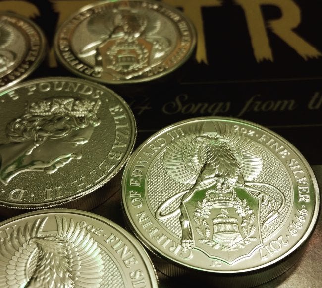 If you've been watching The Crown on Netflix, then you might also have some vague interest in the Royal Mint's new series of silver and gold coins. They're meant to celebrate the Queen's Beasts, the ten sculptures made to represent Elizabeth II's royal lineage, and the two coins that have come out so far (Lion and Griffin) are very high-quality items. In this photo we have a few of the two-ounce silver Griffins resting on the album cover for Lord Huron's Strange Trails.