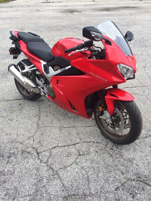 Two days in a row of you smart-alecks who are using my purchase decisions as justification for your own motorcycle choices. John writes, "...thank you for the push I needed to close the deal on this awesome machine." He didn't need any push. Just look at it. I really like what they did with these facelift Interceptors. My 2007 VFR800 has a bit of an "Acura" look to it --- chunky and non-sporty --- but the 2014-and-up bikes look like they could mix it up on the cover of an Electronic Arts video game. Again.