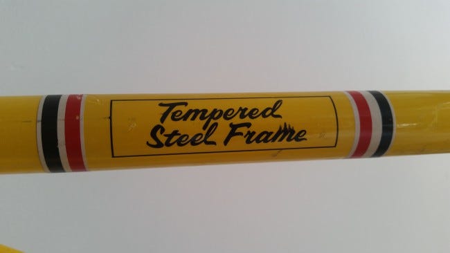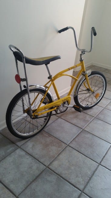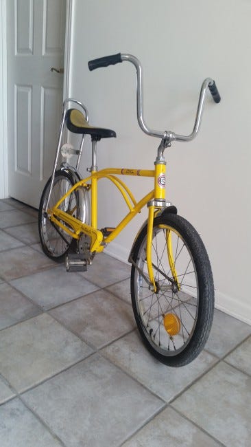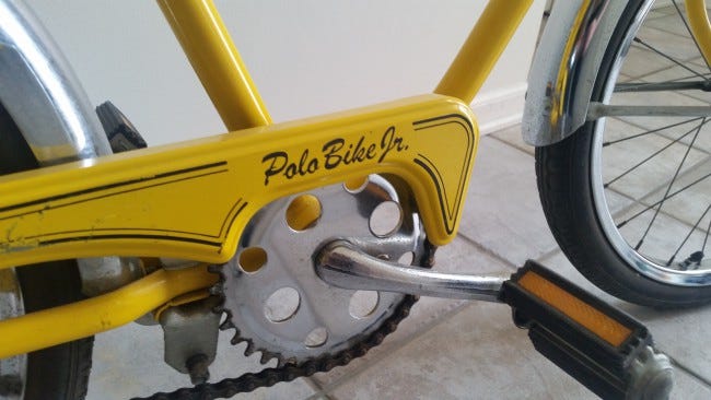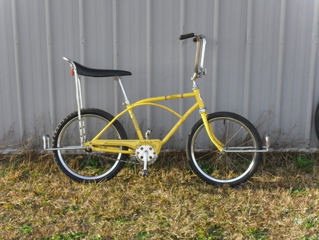 Why, it's a Ross Polo Bike Junior, in yellow. I cannot imagine that any of my readers will have ever heard of the Ross Polo Bike Junior. Few enough of you will have heard of Ross itself, a Pennsylvania-based bike builder that was sort of a distant third to Schwinn and Huffy with virtually no distribution west of the Mississippi. The Polo Bike Junior was a response to the Schwinn Stingray, in more or less the same too-little-too-late way that the Chevy HHR was a response to the Plymouth PT Cruiser. It was really fucking lame, actually.
