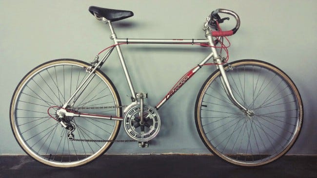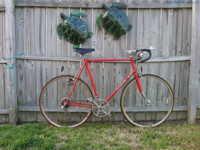 When my parents got divorced, Mom finally listened to my pleas and sprung for a Huffy Carrera ten-speed, like this one. Check out the copyright-infringing logo, stolen straight from the side of a '73 Porsche: