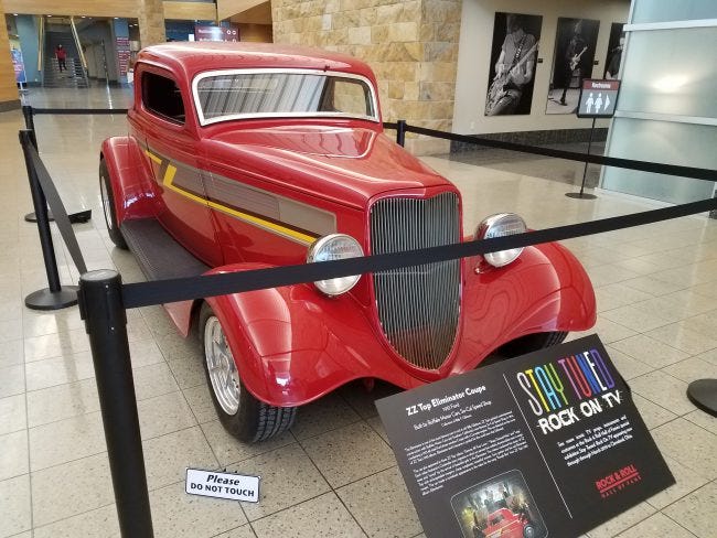 There it was, right in the lobby of Fort Wayne, Indiana's Sweetwater Sound. (Non-affiliate, non-compensated commercial message: for the absolute best deal on a GOOD example of a musical instrument, as opposed to a Guitar Denter special, call Matt Emick at (800) 222-4700 x1249, tell him I sent you.) ZZ Top's "Eliminator" coupe. (Strictly speaking, I believe it's a Tudor, and some of you will know better than I do.) Hard to believe it was just forty-two years old when Billy Gibbons bought it as an unmodified ex-daily driver, and hard to believe it's been driven across the country without incident.