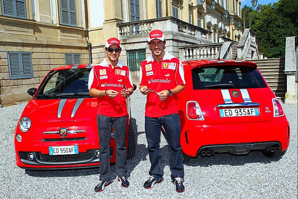 Thirteen years ago I evaluated the USA Fiat 500 Abarth, which wasn’t anything like the Euro Abarth. Instead, it was a North-American-spec 500 with a full SRT makeover. Meanwhile, our overseas cousins had already gotten the 178-horse Abarth 695 “Tributo Ferrari”, show here with two fellows who received them as company cars and appear to be less than thrilled:
