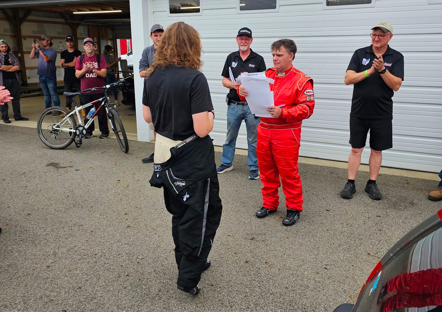 After spinning off in Saturday’s race and fading to the back, Mini Danger Girl qualified second in SRF2 on Sunday, and in fact was in the middle of the overall SRF pack ahead of a few SRF3s, but she looped off Turn 13 while trying to make a pass on a slower competitor. These things happen with exuberant young drivers. The important thing is that her pace is now equal to that of the 20-year veterans in SRF2. I’m excited to announce that she is taking a test in a Formula Enterprises 2 car next month, in preparation for a possible move to FE2 next year and/or a trial seat in F4 afterwards. I think she has a real shot at being competitive against the 16-year-old karting prodigies in F4. There’s just one little problem, which I will illustrate with a picture of her podium announcement showing she is, ahem, head and shoulders over the other drivers: