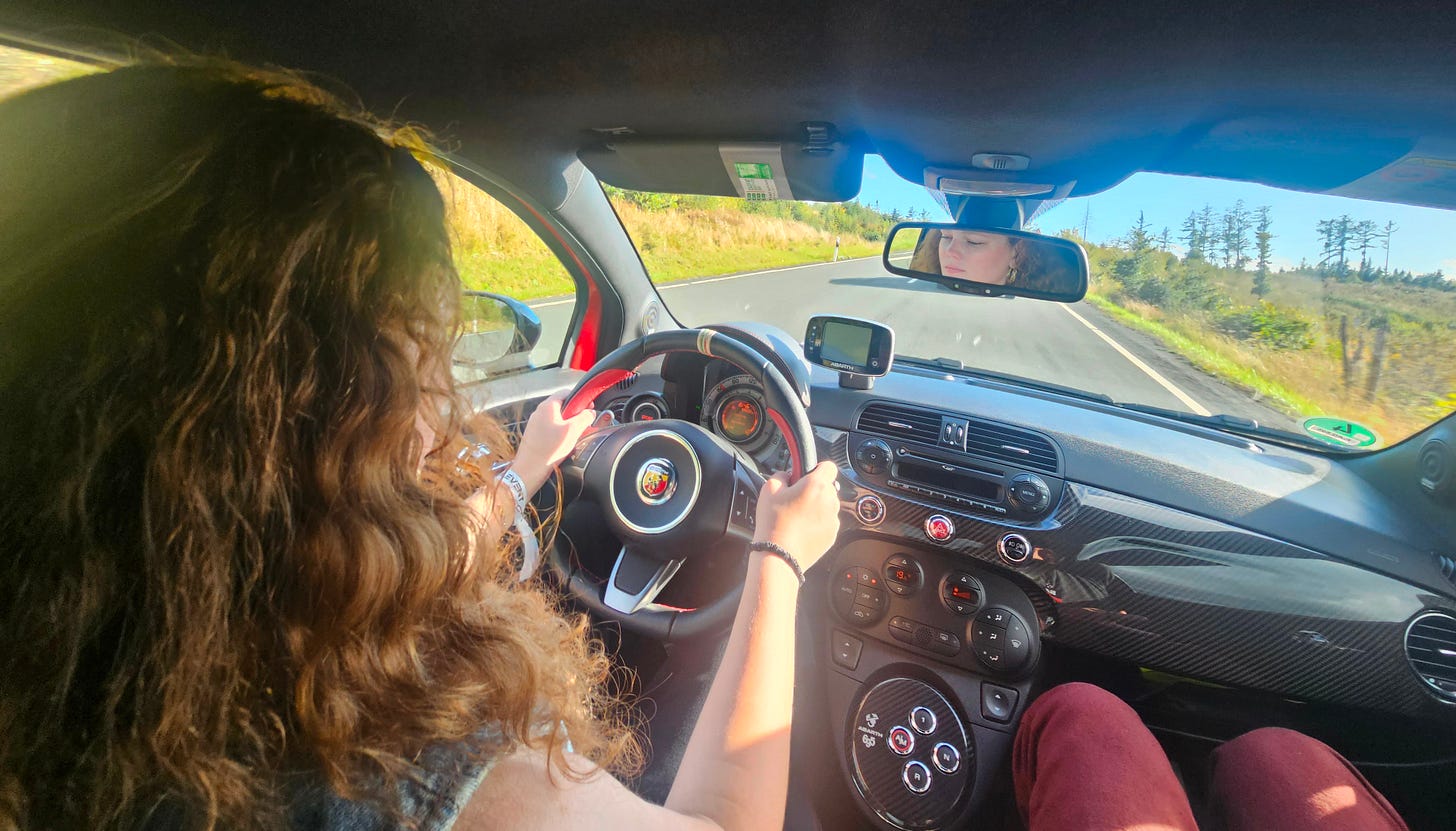 …but three hairpins later, he wasn’t even visible. Suffering through this modern era of silent skateboard-platform exercises in zero tangible character, the buzzy, poppy, kinda-awfully-assembled 695 Fiat is even more of a joy. Even the goofy Ferrari badging is nice. The general vibe can be summed up in one picture: