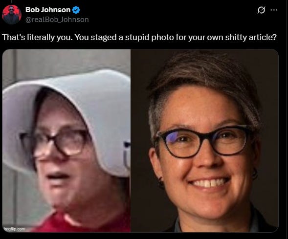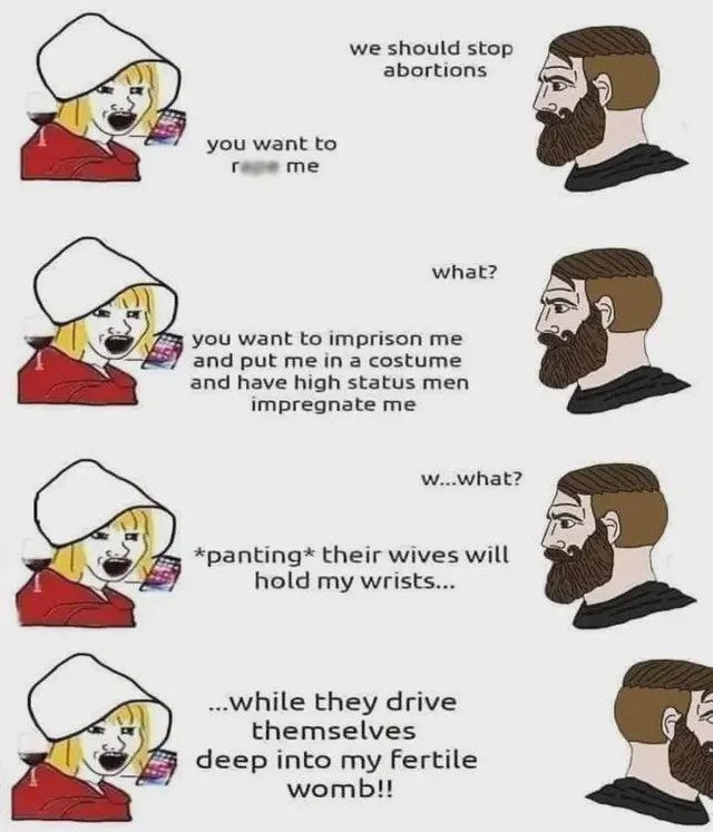 Also, The Handmaid’s Tale is a fetish book masquerading as feminist literature. If you think it’s a serious effort, you probably also think Twilight was an attempt to educate people about the danger of vampires.