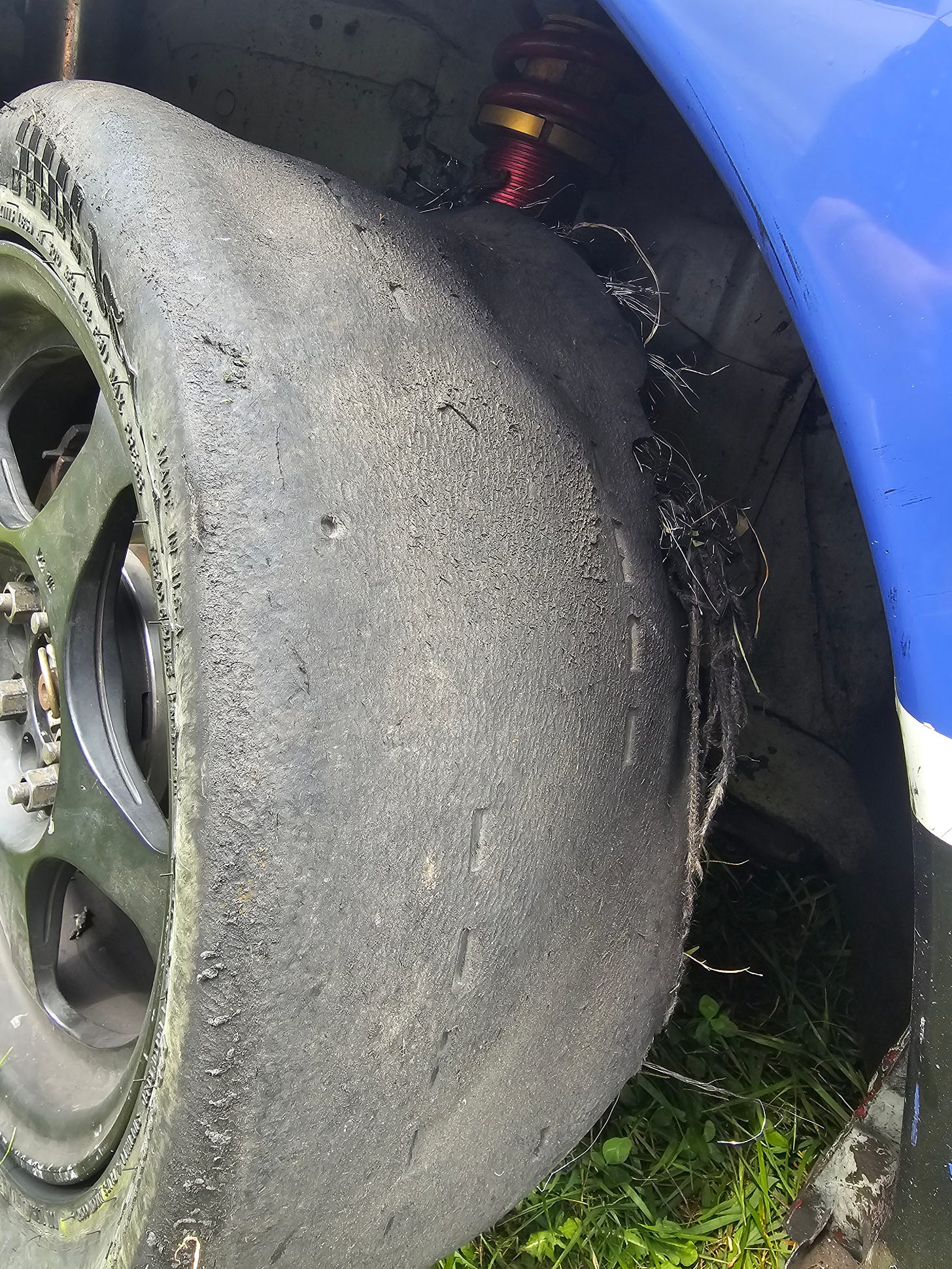 Well, turns out they’d been stored in such a way as to let the belts deform and crack. The video tells the story: I took the lead at the start of the race but the Neon’s behavior got worse and worse until finally the tire literally blew up, sending me off track.