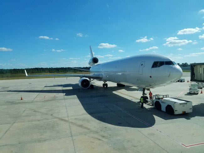 None of the above. These were MD-11F freighters operated by Western Global, part of its eleven identical trijet fleet. Western Global is a very new airline, having recently celebrated its fourth year in operation. You won't ever take a ride on a Western Global plane, unless you are a specialized piece of cargo or possibly a FedEx package on an overflow weekend. (And if that's the case, how are you reading this site?) The last passenger flights to use an MD-11 happened three years ago, with a KLM plane named "Audrey Hepburn". That final flight occurred just a few months after the MD-11's predecessor, the occasionally star-crossed McDonnell-Douglas DC-10, took its final passenger flight with a Bangladeshi airline.