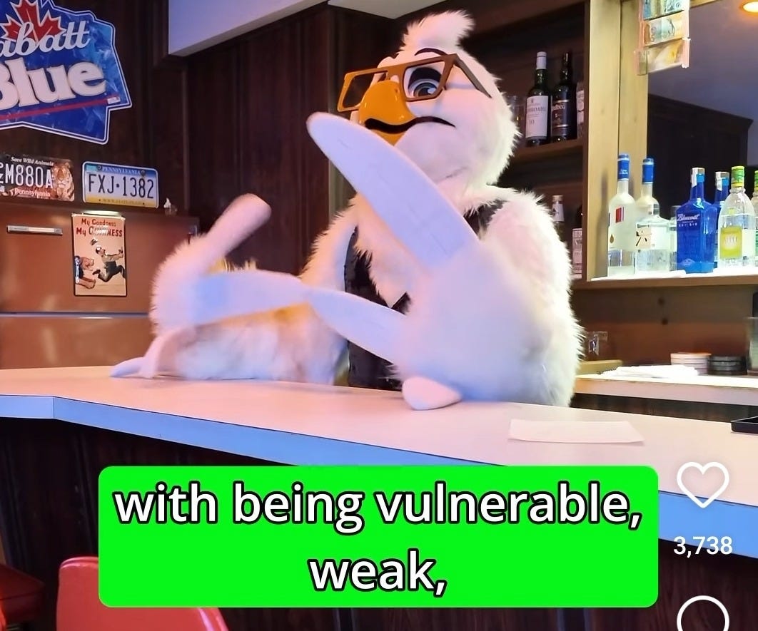 I still recognize, however, that many male high school teachers are profoundly weird dudes and therefore I wasn’t all that surprised when “Mr. Regular”, ahem, transitioned from “self-consciously witty dude who force-fits Foucault into the discussion of four-cylinder minivans” to “semi-insane aggressively queer bird fursona”. I even have a little bit of sympathy for the fellow. All of you at ACF know what I look like, to wit: a hugely ugly dude with a misshapen skull and no two limbs the same length. I despise my appearance and I think it would be neat to hide inside a squid costume or whatever for the rest of my life. Unfortunately, my duties as a father and, ah, conventional-ish man in the American culture prevent me from doing so.