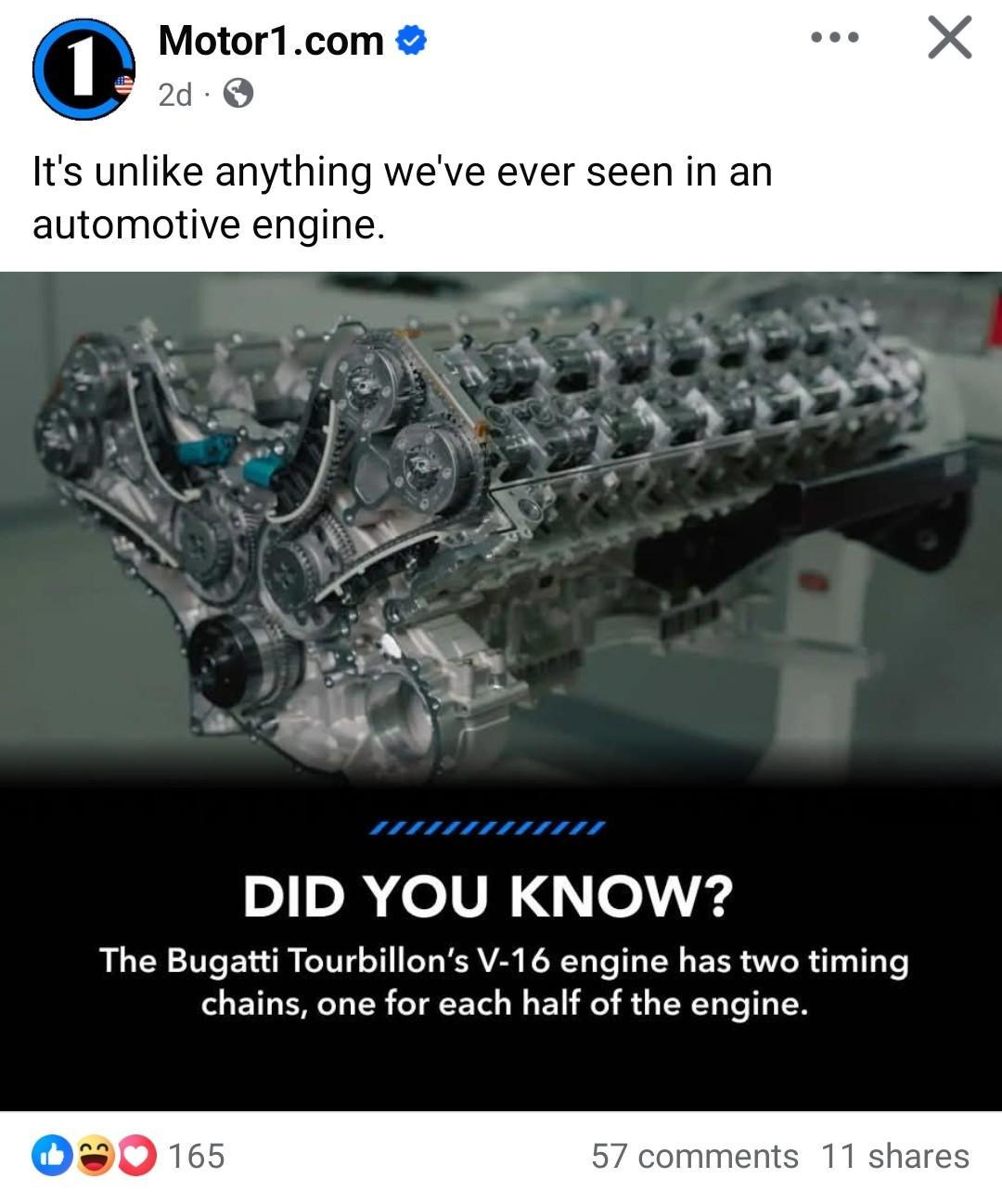 Now, if you actually read the Motor1 article, which I won’t share here for the same reason Arthur Dent doesn’t share the Nutrimatic drink with his friends, you’ll see that the core assertion is a little different from what’s in the social media, namely: that the Bugatti uses an odd combination of timing chains and timing gears. The aforementioned GM High Feature uses an intermediate timing chain to power the two main chains from the central sprocket, but the Bugatti has a Honda-VFR-esque gear drive to the twin timing chains. I can’t think offhand of an engine that does that, but I would be infinitely reluctant to say “it’s never been seen before.”