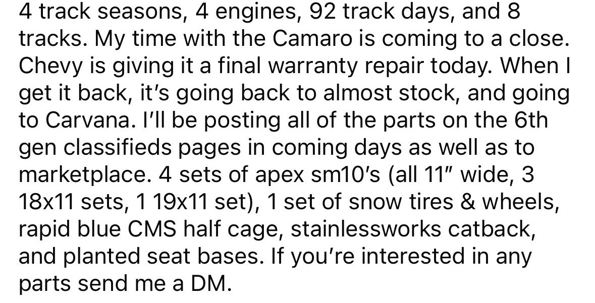 As great as the 5th and 6th generation Camaros are on track — and they are great, they’ve always been better to drive out of pit lane than the equivalent Mustangs — I’d think twice about owning one as a track car. Especially now that the newest of them are coming out of warranty for good.