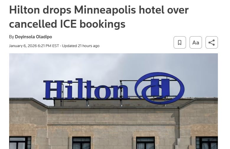 So while the hotel had the right to refuse ICE, Hilton has the right to DELORT them for doing so, and I’m glad they did. Maybe now is the time for all of us to start thinking about how much of the American travel and road infrastructure is owned, operated, and exploited by external and foreign interests that are actively inimical to law and order, to say nothing of peace and quiet, in this country.