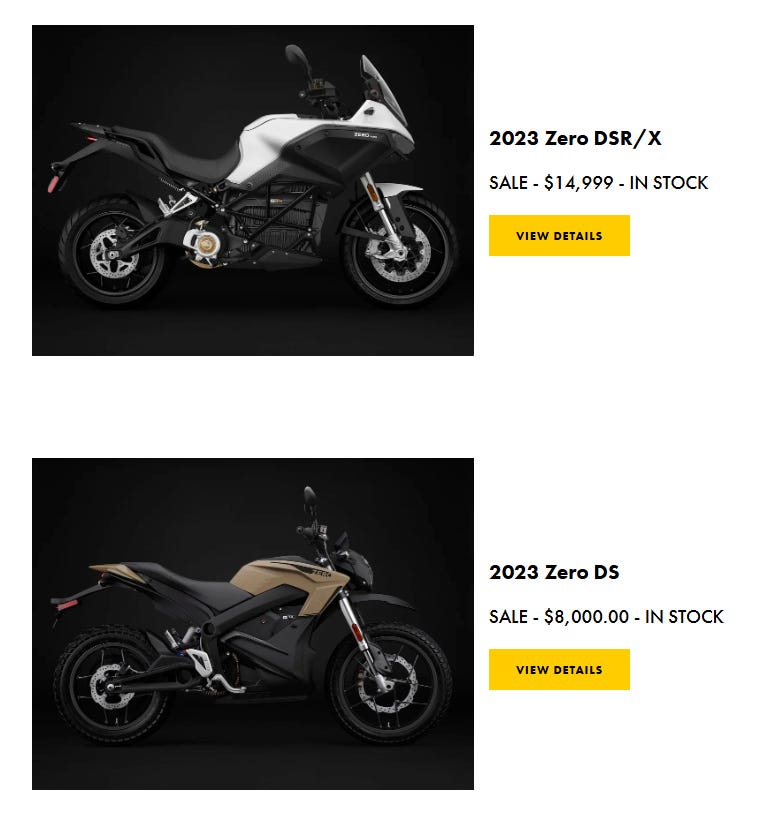 I’m personally offended to have been targeted by an electric motorcycle advertisement; the last time I bought such a thing was ten years ago, and it was for my six-year-old son. So my first thought when I saw this on my Instagram feed was to sneer in disgust and swipe away… but then I saw the numbers “2023” on the ad. Can that be right? Are there still significant numbers of 2023 Zero motorcycles in stock?