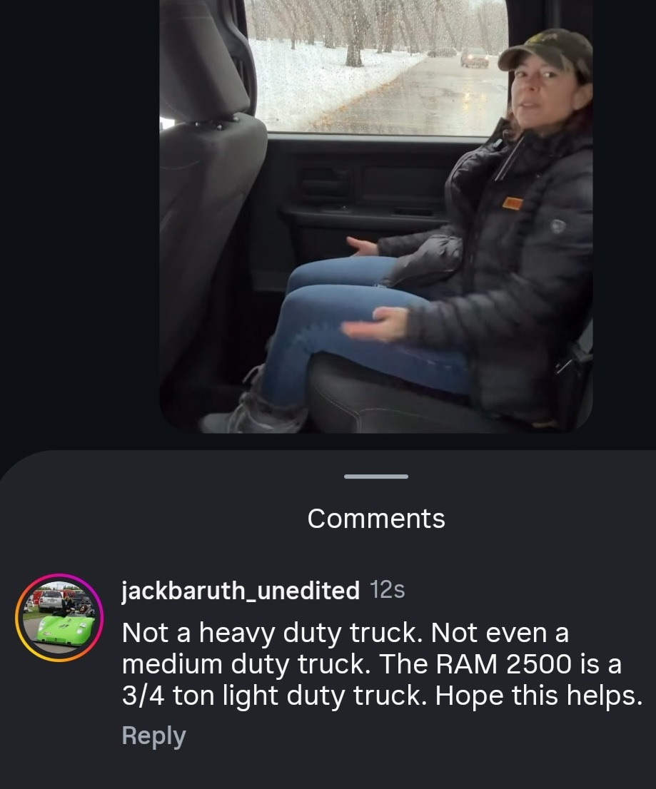 “This week I’m driving the Ram 2500, which is a heavy-duty truck,” she intones. Those ACFers who are reefer mechanics or long-haul drivers probably already have their heads in their hands, but for those of you who have never owned or operated anything larger than an Isetta bubblecar, this is a heavy-duty truck: