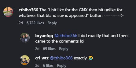 ”Real recognizes real. GNX meets Buick Envista.” Okay, just for clarity’s sake: the GNX was the fastest-accelerating domestic production car over something like a 20-year span, and it was based on the multi-million-selling A/G-body Regal. Most examples were built in Pontiac, Michigan.