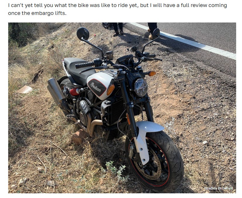 Alas, before my local Indian dealer could actually get an FTR in stock, the company gave one as a long-term loan to Fat Brad Brownell, who proceeded to waddle around on the thing for quite some time and in many ways became the public face of the FTR1200, at least to the automotive-web-reading crowd. Of course, that was all before going to another Indian press event and riding the FTR they gave him for that event into a ditch, as seen above. (They still invite him to every press rides, presumably because they’re going to crush the bikes afterwards or something like that.) Not only was I unwilling to pay real money for something the company was giving to idiots for free, the idea that I was even interested in the same bike as Brad made me reconsider my choices a bit. I mean, I wouldn’t ride anything else he had, if you catch my drift, even if you put a gun to my head.1 So while there are currently eleven motorcycles in my barn, you won’t find an FTR among them.