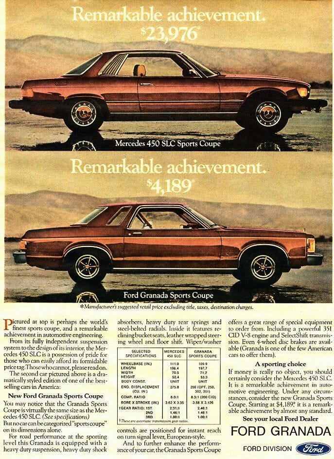 At the very least, the business fallout from this will answer the question of “What if the 1977 Ford Granada had been priced the same as the Mercedes 450SLC they advertised it against?”