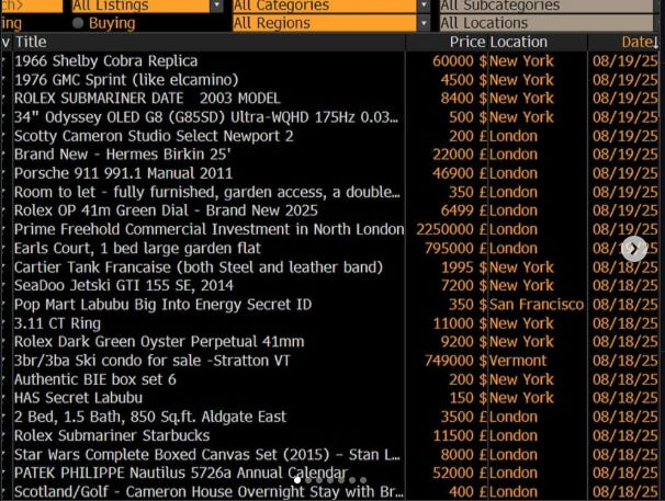 The following screenshot has been going around for a few days — and what interests me is that there really aren’t any deals to be had. The watch prices are near the bottom, but not at the bottom, of Chrono24 dealer listings. Which means they’re considerably above what people are getting paid by dealers, and somewhat above what people expect for private transactions. The Birkin might be a deal, depending on color. The Have A Seat Labubu is a deal.