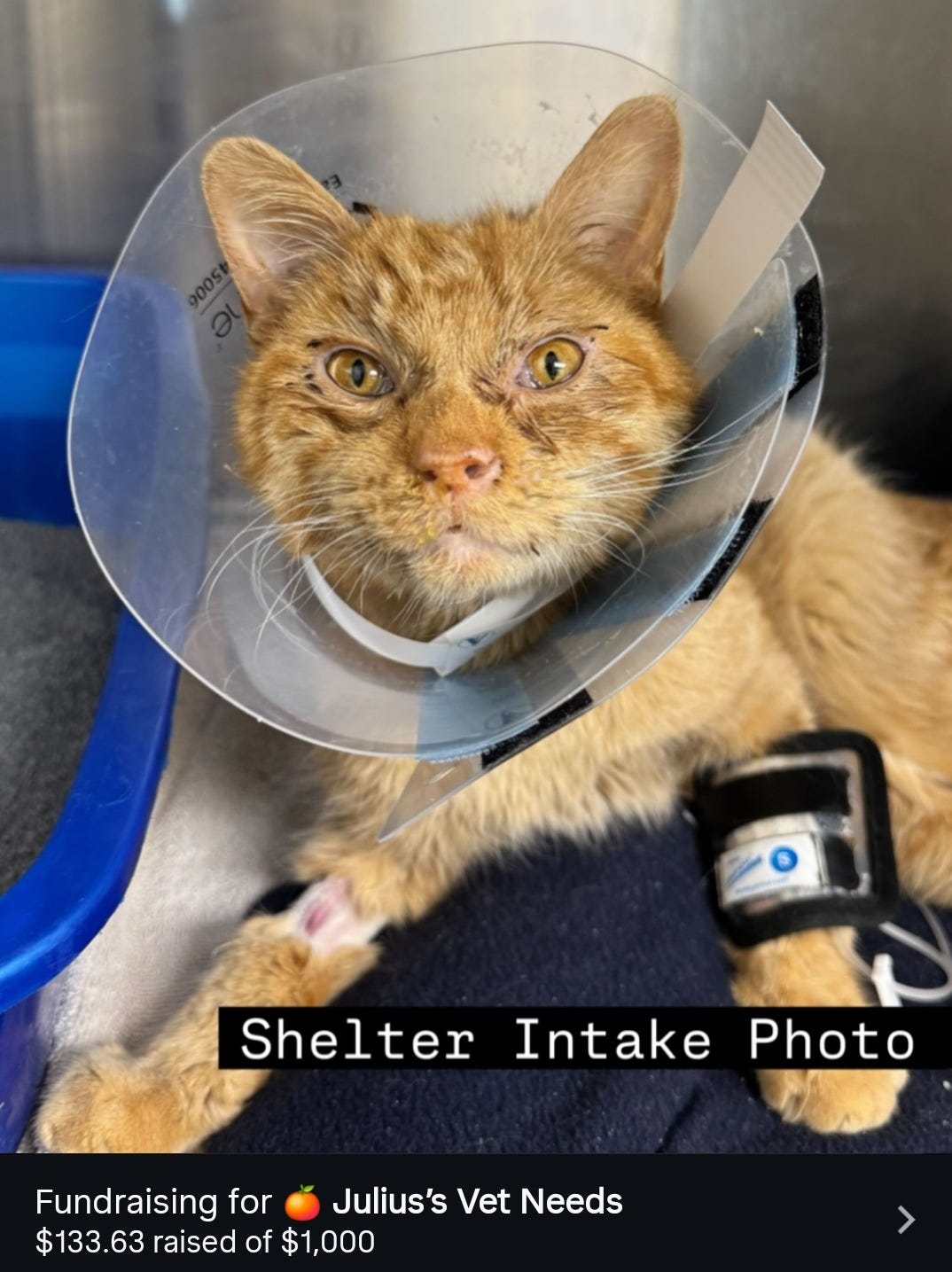 Well, as Bernie Sanders famously said, I am once again asking for your support. “Julius” is an older cat who was brought in from the streets because he was unable to fight off an upper respiratory infection. He’s doing well now and is in foster care.