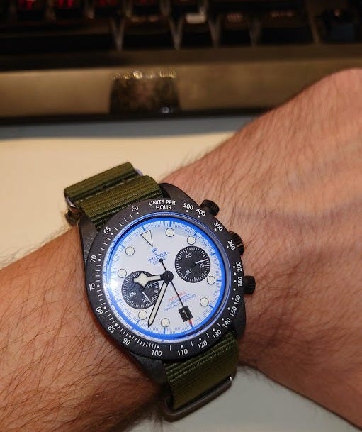 I did not expect to see this watch on TV literally the day after I bought it. Good on Isaack Hadjar!1 The buying experience was pleasant, since I've bought my more valuable watches - all two of them - at a family-owned jewelry in Stuttgart. No need to beg for a reservation, that's not how it's done over here. Kutter are concessionaires for Tudor, not official dealers, so they have been allocated two of the Carbon 25s. Paid list (€7.350.-), got offered drinks and a courtesy airport bottle of black gin and I was out of the door.