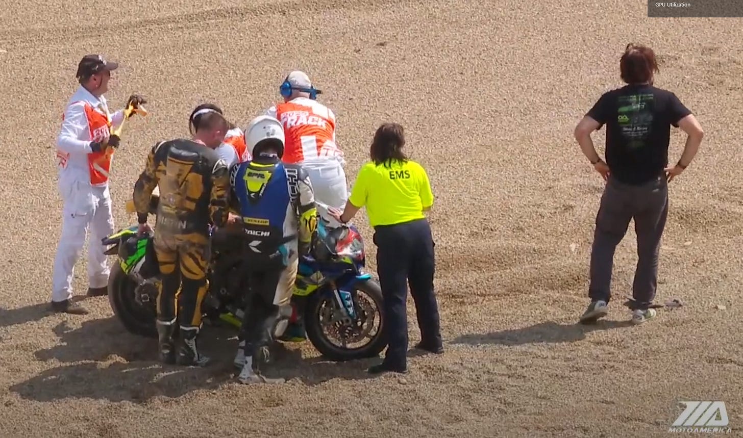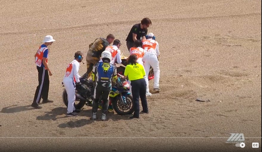 Postscript: I did, in fact, eventually help with the downed MotoAmerica bike. Turns out my new habit of deadlifting a few hundred pounds while listening to Clairo and sobbing quietly is paying dividends, because nobody else could drag the bike through the “China Beach” gravel. And yes, there’s proof! See you later this week!