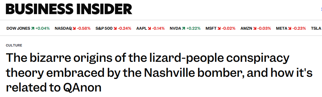 My occasional reference to “lizard people” on this site and elsewhere has at least one reader quite upset — but since we strive to serve all (paid) subscribers here at ACF, I thought I’d take a moment to clarify it, once and for all. Even though I’ve done it once before. Note that I do not actually believe in reptiles wearing human skin, and neither does anyone else worth discussing. The media outlets who breathlessly prattle on about Crazy Stuff The Prole Trash Actually Think are revealing more about themselves than about “Qanon”.