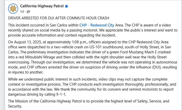 Well, according to the California Highway Patrol, the Mach-E wasn’t necessarily at fault. The driver was drunk. Is that why he was praying?