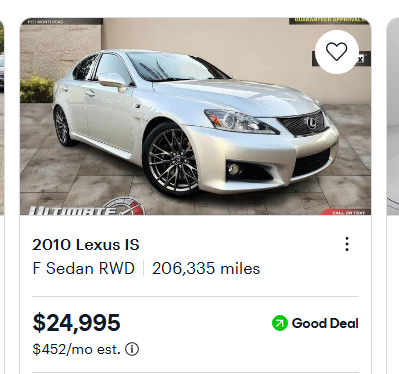 If you have the ability to do this, run don’t walk to your local Lexus dealership and make sure you get one of the final IS500 Ultimate Editions. Especially if your dealer, like this Connecticut dealer, isn’t marking them up. This is a car that will depreciate in glacial terms. Not convinced? Let’s see what the old ones go for:
