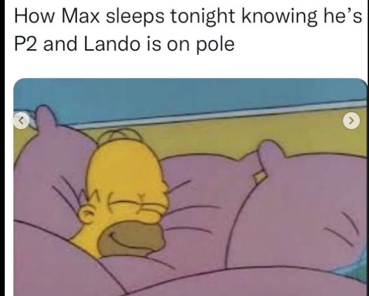 Not improving under pressure: McLaren engineers, who let the car ride too low in pursuit of pace that would allow Lando to dispense with Max before the self-doubt started. The double disqualification of the Papaya cars means that Max is tied with Oscar, and 24 points behind Lando. Everyone’s doing the math, but it boils down to: If Max finishes both GPs and the Sprint in first and Lando is right behind him, then Lando still wins the WDC by nine points. The obvious solution: Yuki needs to bump into Lando while he is getting lapped. You just know that Flavio Briatore would do it that way, right?