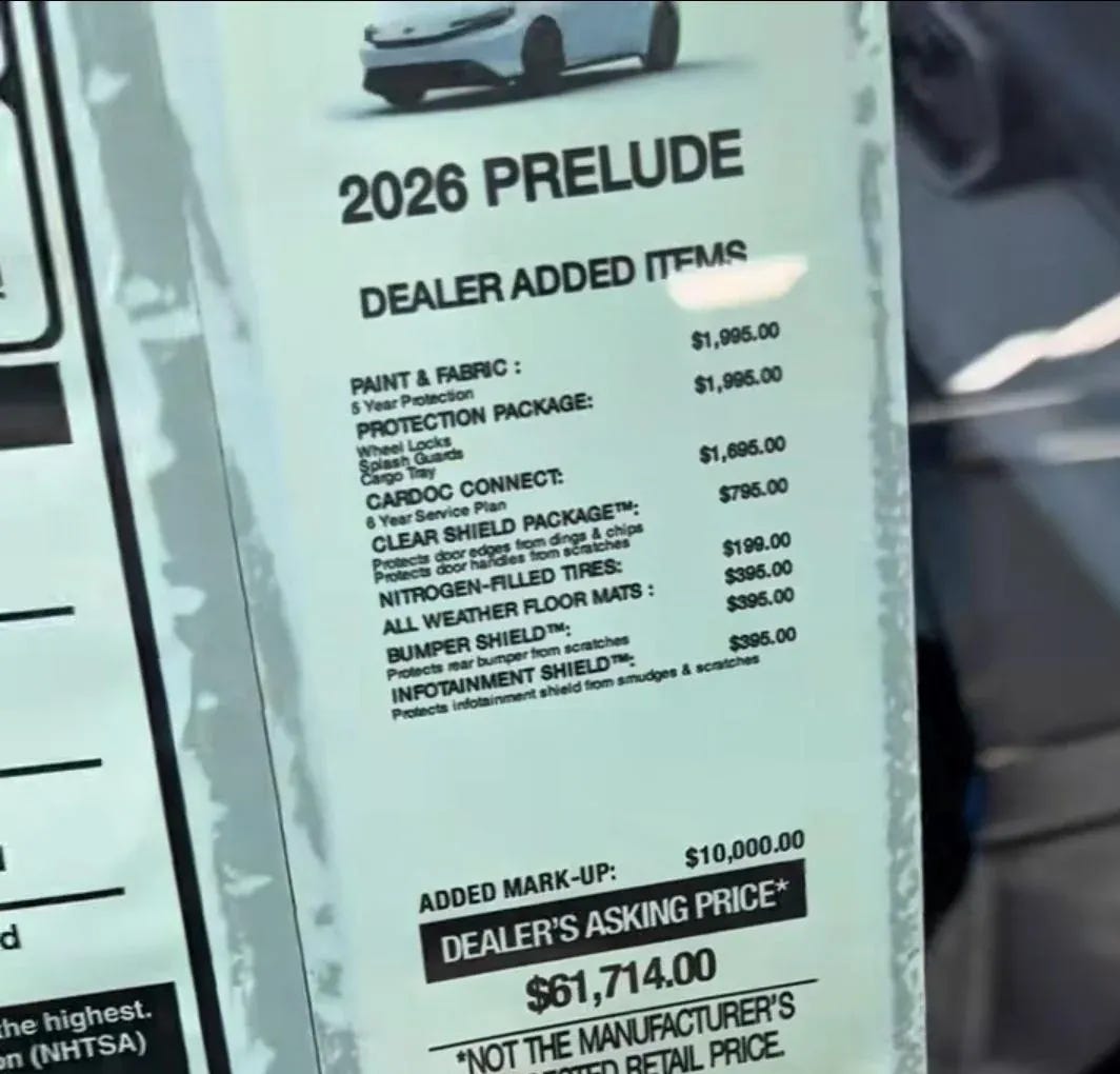 I don’t know how legit this picture is, and I haven’t been able to get any general idea of dealer sentiment with a few calls, but it does seem like the new Prelude, which is already strongly priced at nearly $44k including destination, will be the subject of additional dealer markup in the early months of its arrival.