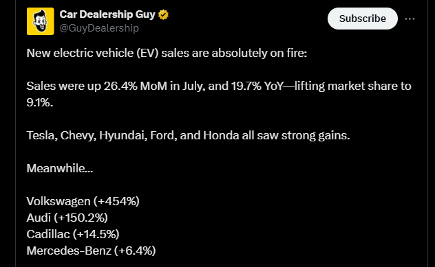 After being browbeaten by the crowd on X and Instagram, the “Car Dealership Guy” apparently edited his posts to mention the end of the Federal tax credit. Did he just not realize that before? Did he think there was a genuine groundswell of support for EVs? Did he think that the EV sales would just keep increasing?
