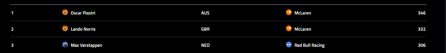 History may record Lando Norris and Oscar Piastri as being nothing more than the whetstone on which Max Verstappen sharpened his craft to perfection. Does anyone really think the RedBull is the best car on the grid? Of course not. Yet here we are with just thirty-four points between Oscar and Max. It’s the kind of margin on which one could sleep soundly if the driver in arrears were Danny Ric or even Sebastian Vettel, but when it’s Max a thirty-four point buffer feels like an imminent disaster. Largely because if Max wins the rest of the races, he has won the championship no matter what happens behind him. Again, this would feel like pure minotaur-level fantasy with any other driver on the grid, but somehow it’s about a 50/50 possibility now. Get ready for McLaren to revamp the Papaya Rules. The only question is: will Lando willingly give up his shot at the crown to make sure Oscar keeps his?