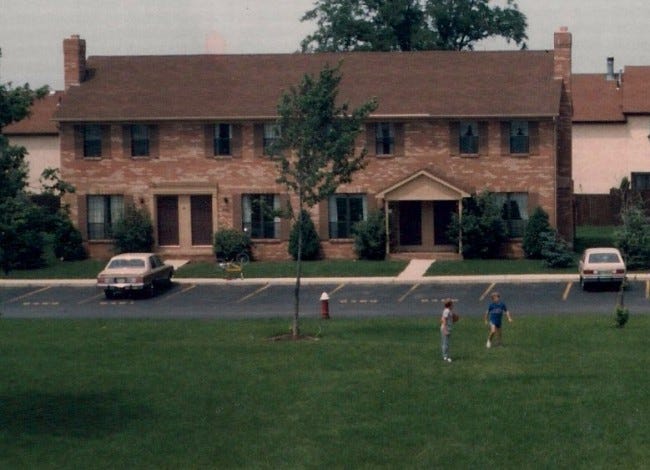 Well, what do we have here? Looks like Riverside Village, the spectacularly dingy apartment complex of my early teen years, complete with Mom's '84 LTD and my '85 Redline 600c. My guess is that is late May or early June of 1986, because I can see the semi-bent OEM seatpost that I had on there before I got a proper layback.