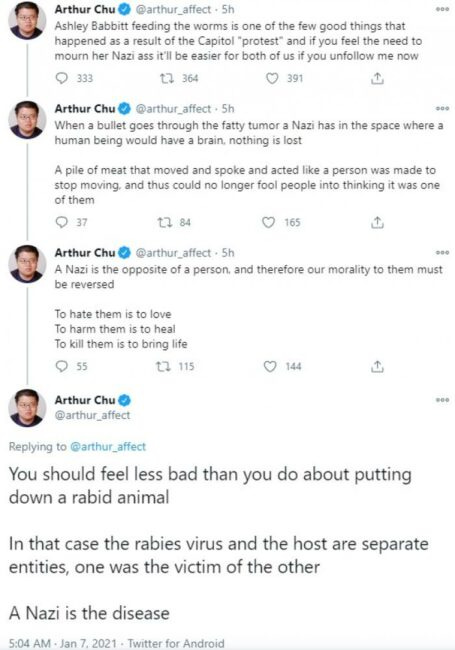 Arthur Chu isn't a terribly important person --- he was on Jeopardy! a while back, I think that's the extent of his fame --- but his sentiments have been widely echoed across the Internet. It's worth noting that he felt perfectly comfortable expressing these sentiments in public; we all know that America's "cancel culture" only really works in one direction. There's also been a lot of hilarity expressed about the fact that a rural woman carrying a "Don't Tread On Me" flag was trampled to death in a crowd panic.