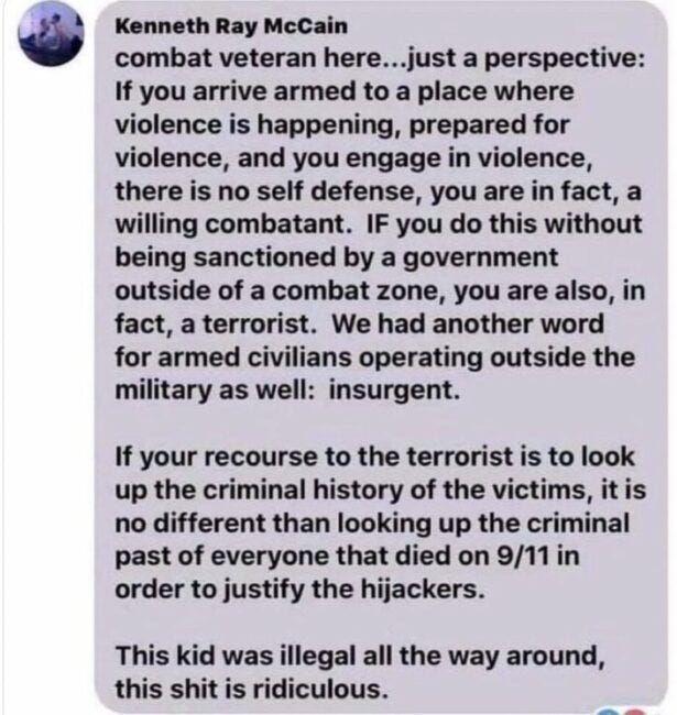 Ah, but the state of Wisconsin was quite interested in prosecuting Kyle Rittenhouse. Let's review the salient portion of the "combat veteran" quote here, since it was widely distributed on Instagram and Twitter by Blue Tribespeople who thought they were making a point: