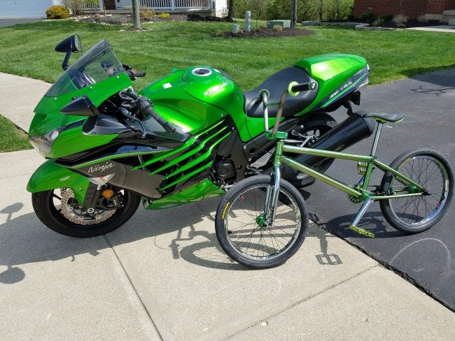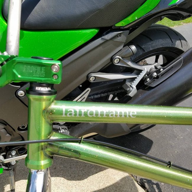The third-best thing about the frame, after the custom "Kraken" seat stay brace and bottle-opener chain stay brace, is something that I did not expect, because I didn't order it that way. I'd specified a Lamborghini lime green candy coat. Somehow the signals got crossed and I received "Emerald City". As you'll see in the photo below the jump, it's really handsome. Click to see the bike and to catch up on last week's contributions.